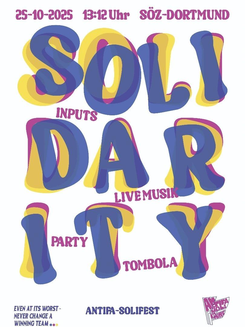 Plakat mit dem Wort "Solidarity" in Großbuchstaben bildfüllend gesetzt, dazu die Daten 2025-10-25, 13:12 Uhr, SÖZ-Dortmund. Antifa Solifest. Inputs, Livemusik, Party, Tombola. Even at its worst, never change a winning team"